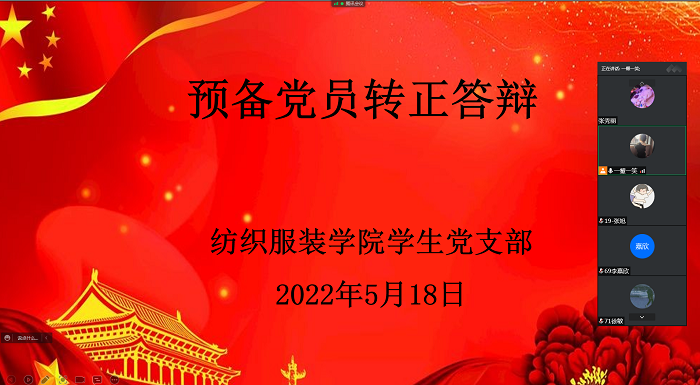 5月18日下午,纺织服装学院学生党支部在线上腾讯会议召开预备党员转正答辩会,学院党总支书记宋孝浜,副书记杨军及学生党支部委员担任评委。答辩会由学生党支部书记孙静主持,36名预备党员参加。