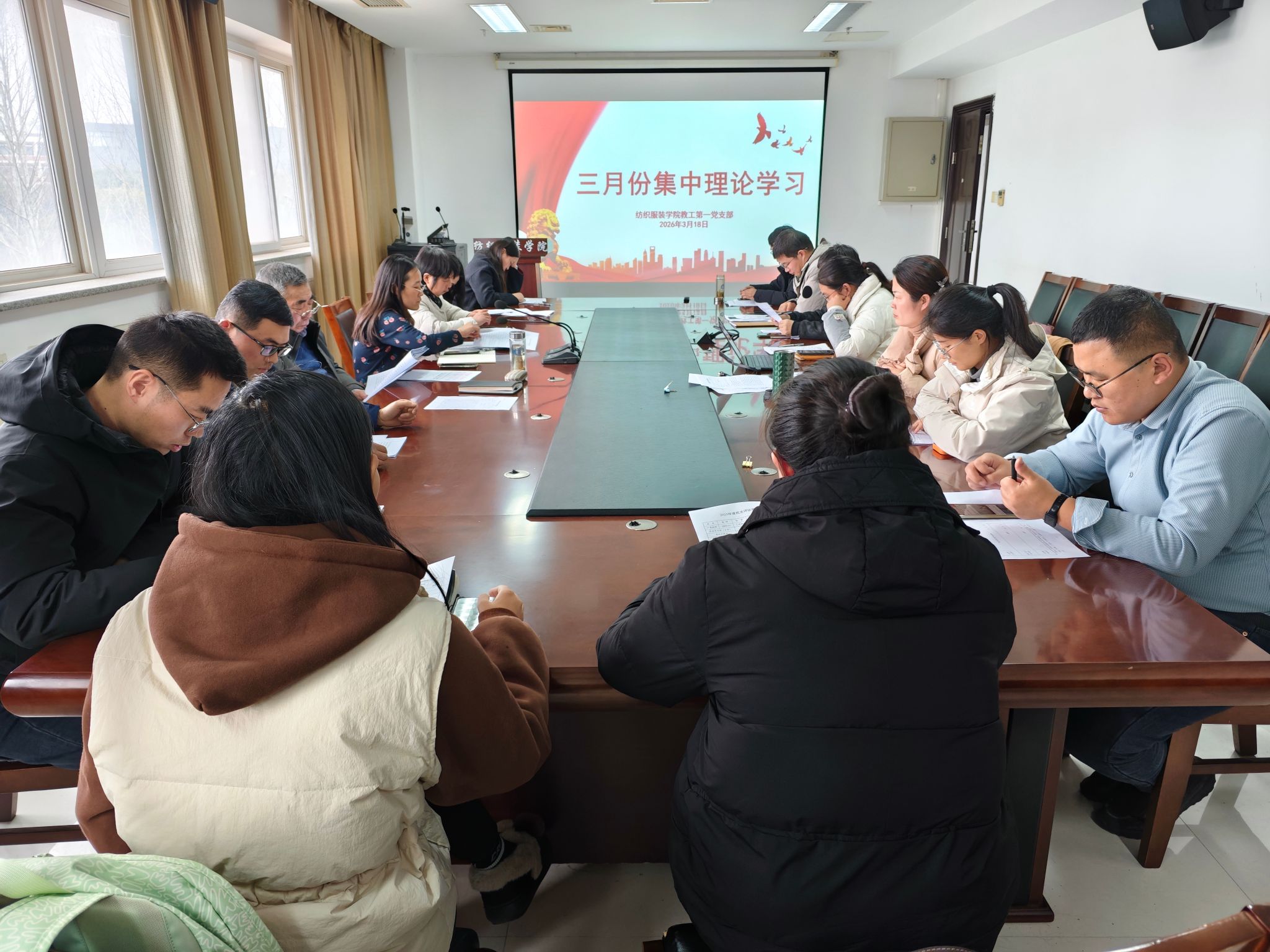 3月18日下午,纺织服装学院教工第一党支部在学院会议室召开3月份党员集中理论学习会。党支部书记林玲主持,支部全体党员参加学习。