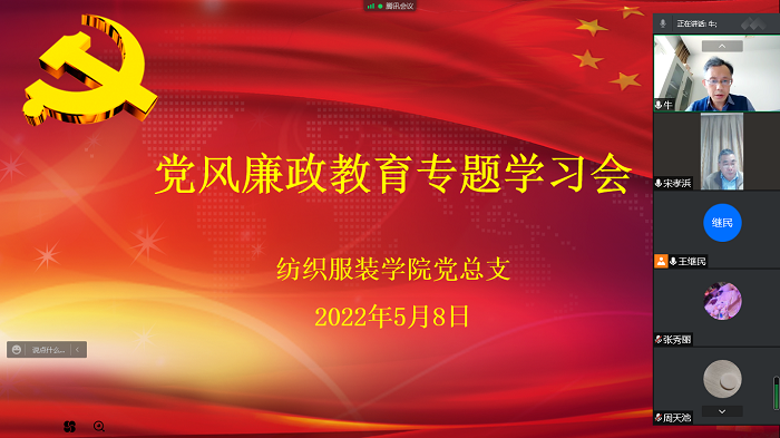 5月8日下午,纺织服装学院召开党风廉政教育线上专题学习会,党总支书记宋孝浜主持学习会,学院领导班子成员、各科室、专业系、实验中心主任参加学习。