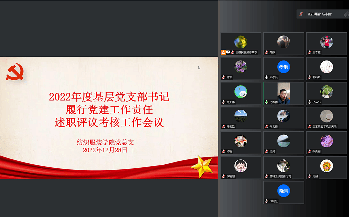 12月28日下午,纺服学院在线上腾讯会议举办2022年度党支部书记履行工作责任述职评议考核工作会。学院党总支书记宋孝浜主持,教工、学生党支部书记,教师党员代表参加。