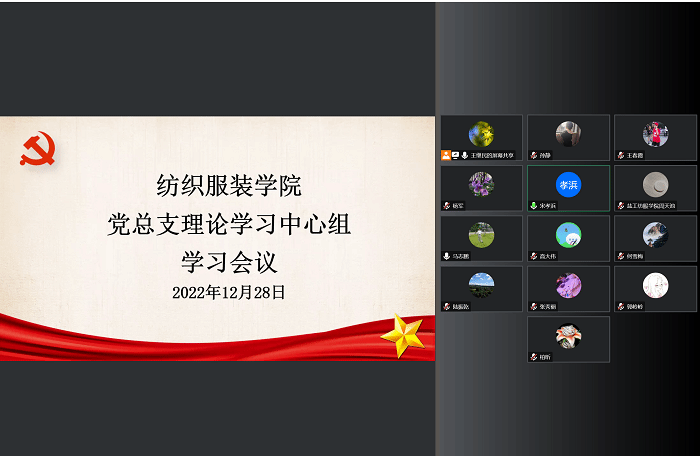 12月28日下午,纺织服装学院党总支理论学习中心组举行2022年秋学期第五次专题学习,党总支书记宋孝浜主持学习,学院中心组全体成员参加学习,本次学习采用线上集中学习方式。