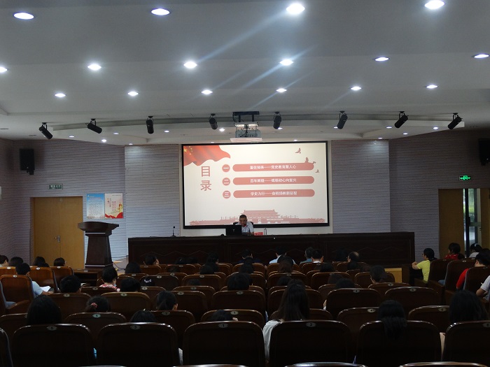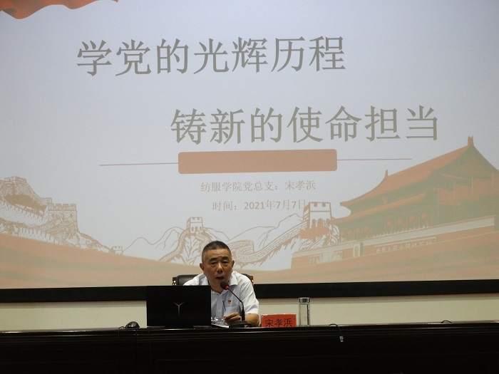 7月7日上午,在南校区土木馆报告厅,纺织服装学院党总支书记宋孝浜以《学党的光辉历程 铸新的使命担当》为题上党史学习教育专题党课。校党委党史学习教育巡学督学第三指导组组长杨怀祥、副组长朱凌、组员曹玉娟出席,纺织服装学院全体党员、中心组全体成员、部分入党积极分子参加。