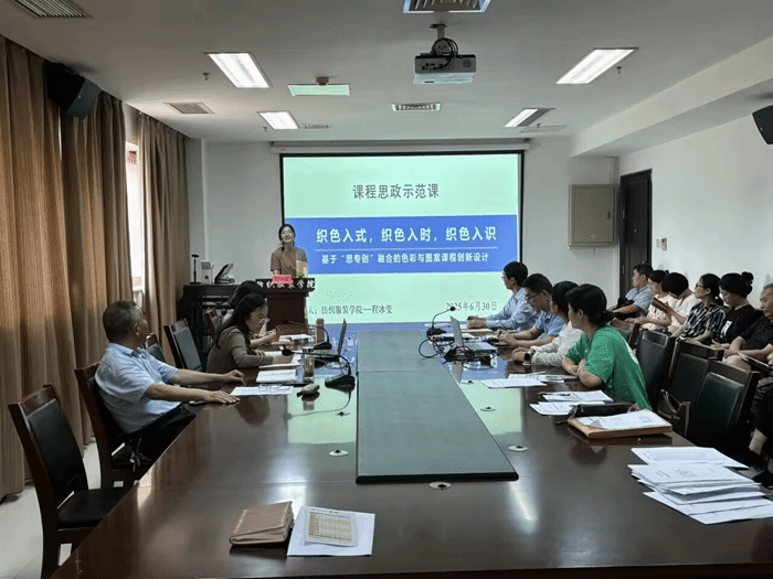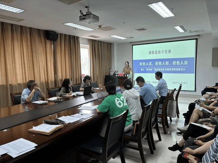 6月30日下午,在纺织服装学院会议室,纺织服装学院开展《色彩与图案》课程思政示范公开课,服装设计与工程专业系主任程冰莹主讲,学院全体教职工近50人参与。