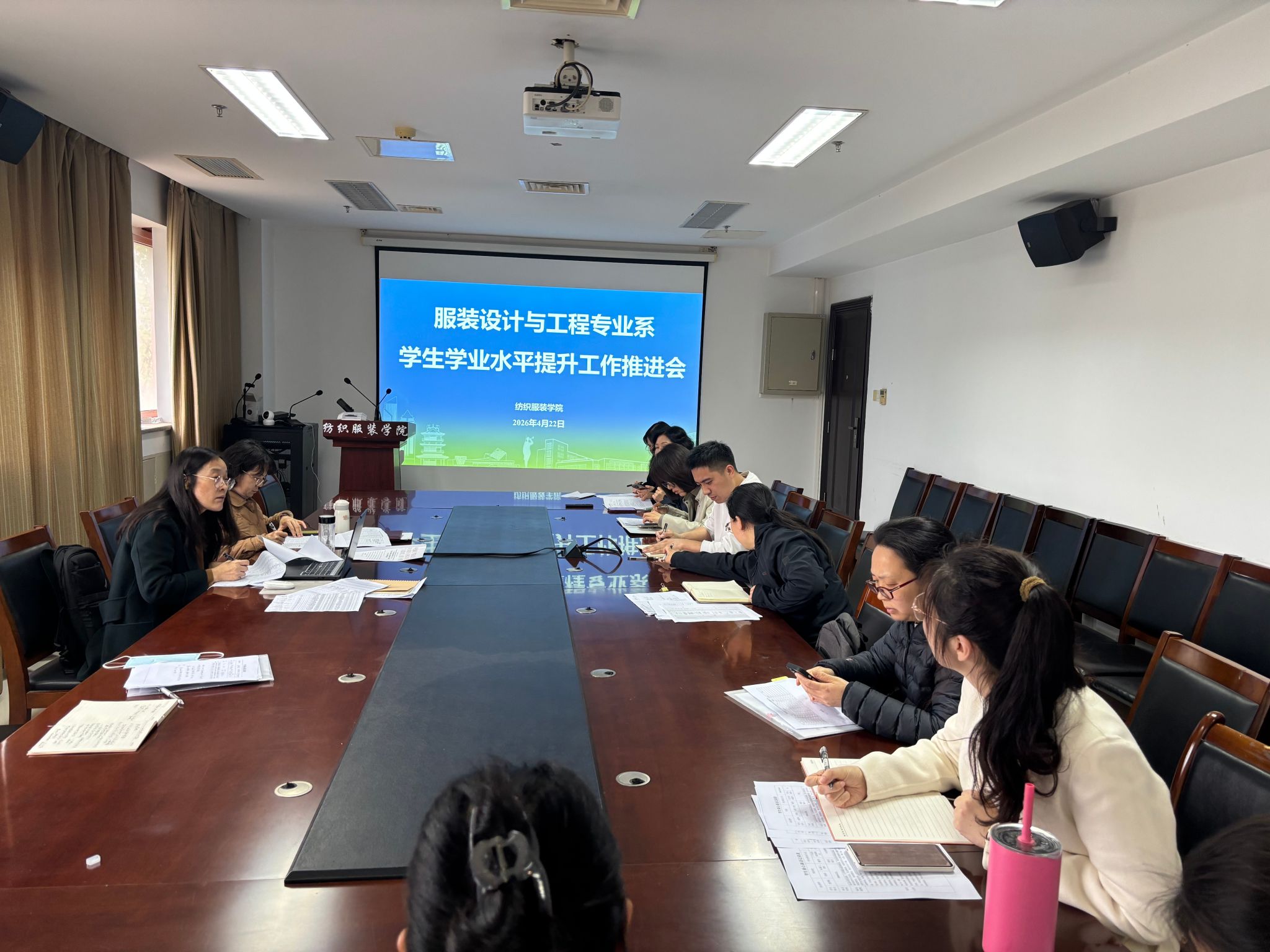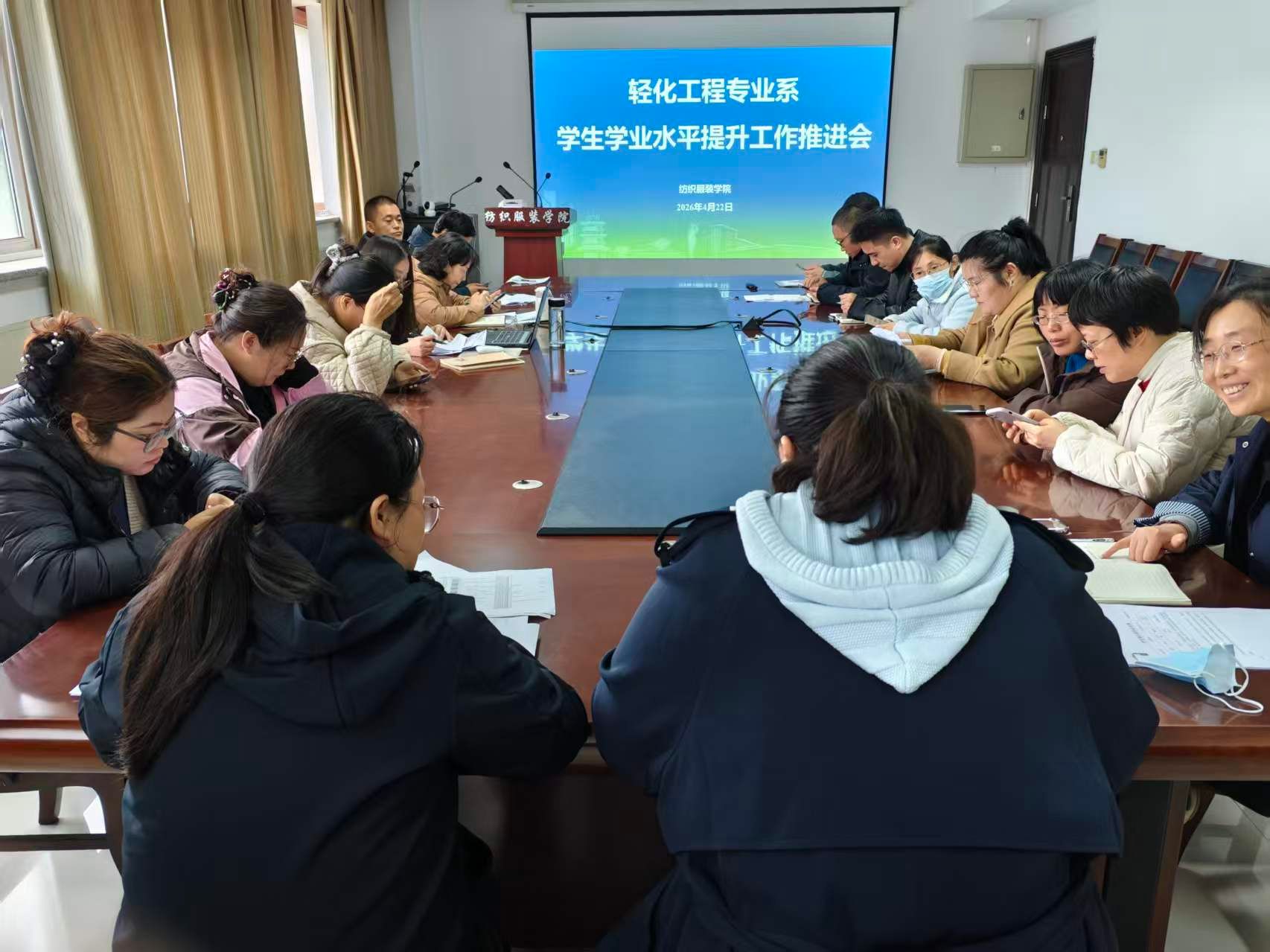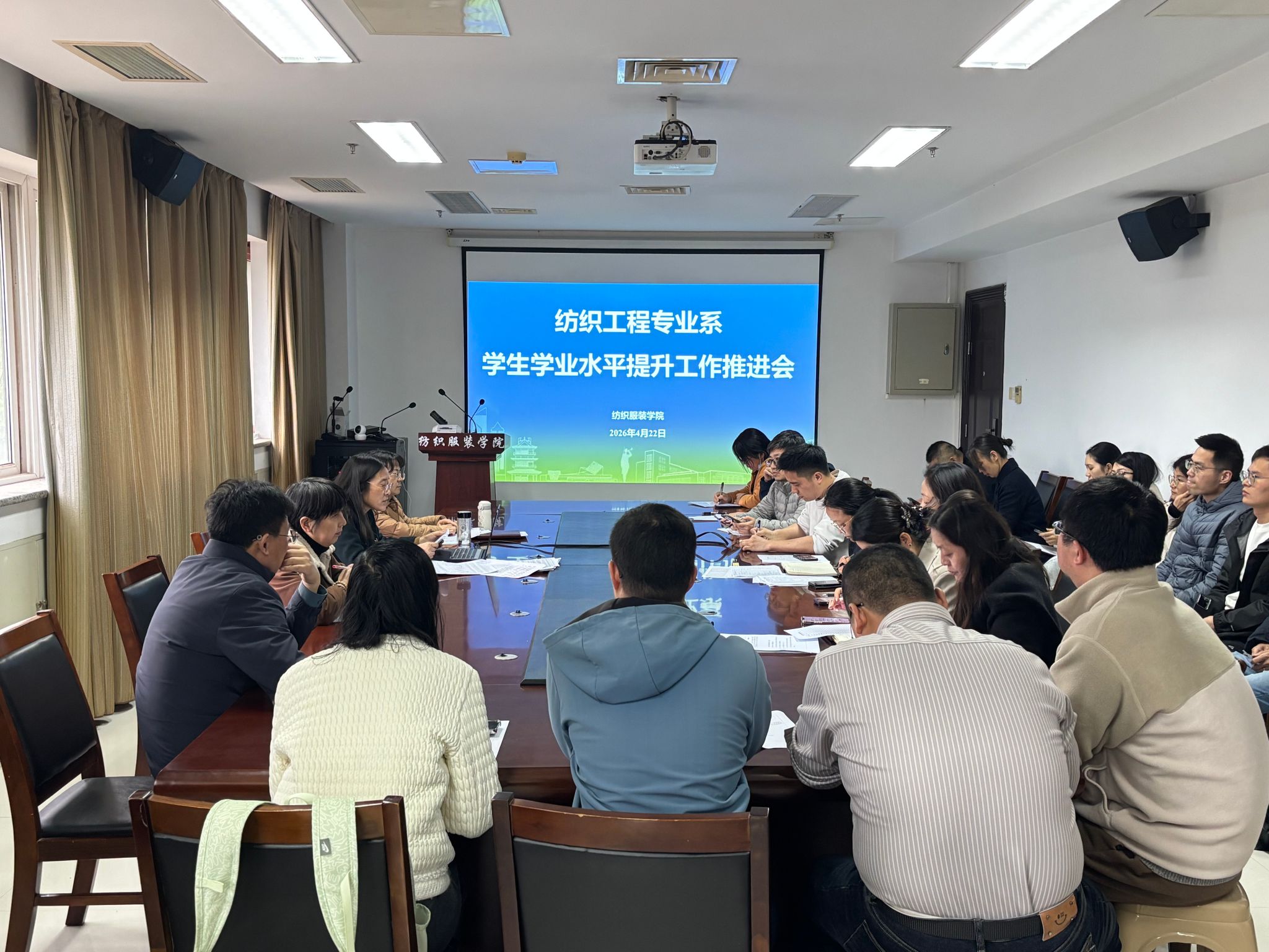 为持续抓实优良学风建设,精细化做好学生学业水平提升工作,稳步加强本科育人质量,4月22日,纺织服装学院按照专业系分批在学院三楼会议室召开学业水平提升工作推进会,学院院长王春霞,各专业系主任、全体专任教师及责任班级辅导员参会。会议由党总支副书记吴晓静主持。