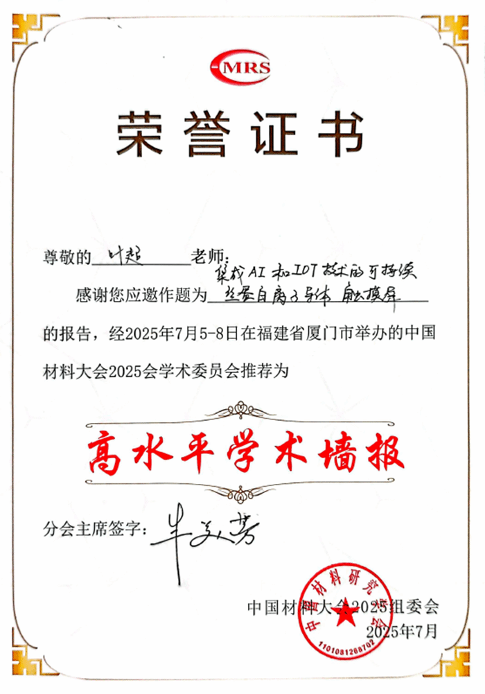 叶博士以“集成AI和IOT技术的可持续丝蛋白离子导体触摸屏”为主题进行了墙报交流并获得了“高水平学术墙报”奖。该墙报基于传统柔性电子领域缺乏兼具机械性能与环境兼容性的材料这一背景,展示了通过湿度诱导结晶策略优化丝蛋白离子导体中丝蛋白分子链结构,在保持优异离子导电性的同时,提升了机械性能和环境稳定性,提供了一种可回收、生物可降解的可持续柔性电子材料。此外,结合表面电容技术、物联网和人工智能技术,成功开发了绿色环保、智能化的触摸屏设备,具备触摸感应、远程控制、手写识别和智能人机交互等功能,在智能可穿戴电子领域显示出广阔应用前景。