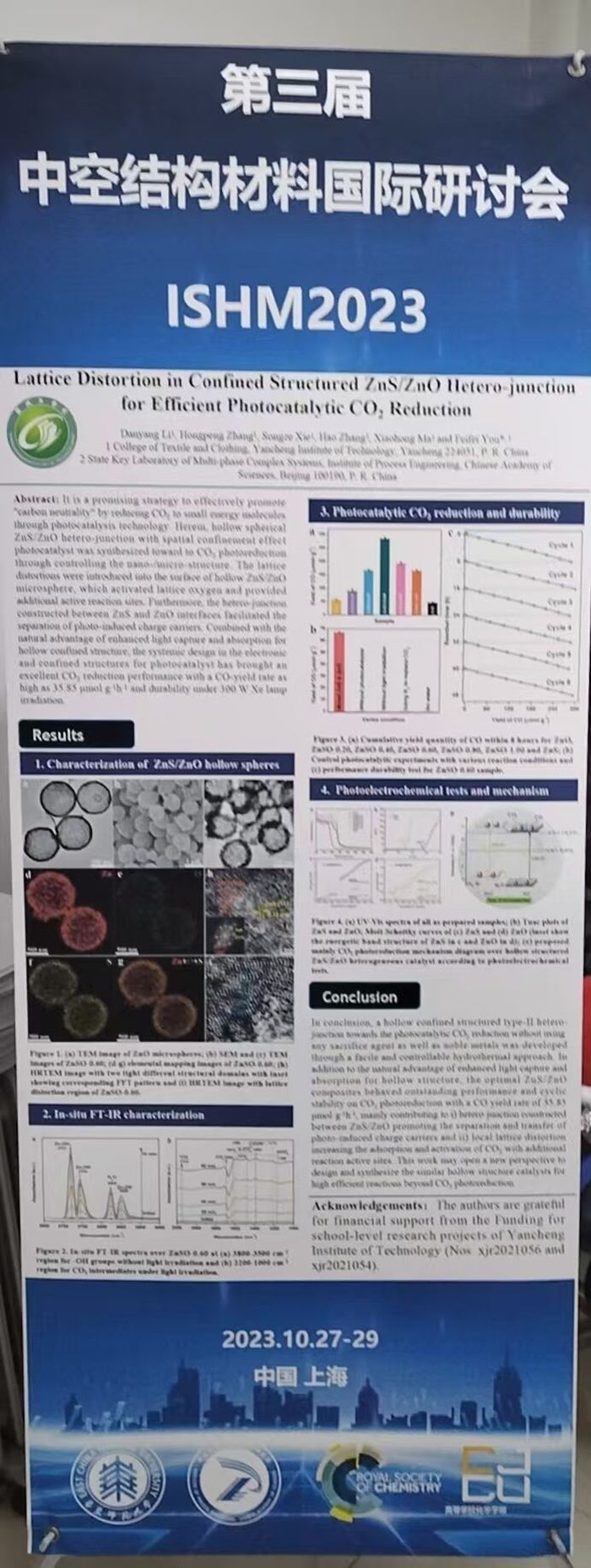 2023年10月27-29日,我院青年教师由飞飞博士参加了2023年第三届中空结构材料国际研讨会并提交墙报。本次研讨会由华东师范大学化学与分子工程学院和中国科学院过程工程研究所主办、英国皇家学会和高等学校化学学报协办,以“中空结构材料”为主题,是继2017年青岛论坛、2019年北京论坛成功举办之后的又一次盛会。研讨会邀请到中空结构材料领域的国内外顶尖专家,深入讨论领域前沿研究和应用,包括但不限于空心结构的设计、合成、性能和应用。研讨会包括特邀报告、青年学者报告和学术墙报等环节,设立报告和墙报奖项。