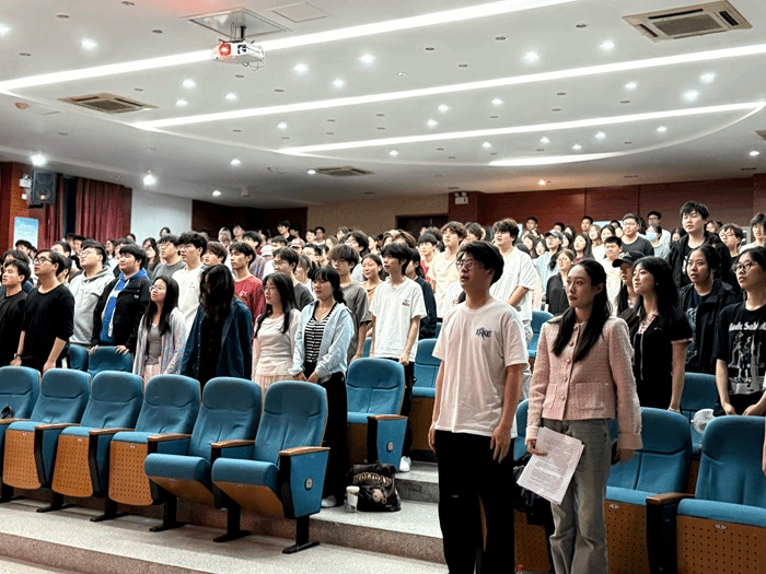 为进一步激发学风建设活力,营造浓厚的学习氛围和良好的育人环境,总结成绩、宣传典型、表彰先进,全面提升人才培养质量,4月17日晚上七点,纺织服装学院在润美楼报告厅召开2025年学风建设表彰大会。学院党总支书记宋孝浜、院长王春霞、副院长马志鹏,全体专职辅导员、受表彰学生、大一、大二约300名学生共同参与。大会由学院党总支副书记吴晓静主持。在嘹亮的国歌声中,大会正式拉开帷幕。