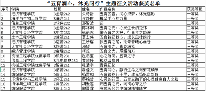 纺织服装学院坚持五育并举、三全育人,积极开展“五育润心,沐光同行”心理健康教育活动。在校心理健康中心的带领下,五月我院协办开展了“五育润心,沐光同行”主题征文活动,旨在通过学生写作讲述成长中德智体美劳的价值,引导大学生重视心理健康、培养健康平和心态,并激发大家对心理健康的关注。本次征文主题为“五育润心,沐光同行”,最终共收到征文86篇。同学们可根据主题自行确定征文题目,体裁丰富,包括但不限于诗歌、随笔、感想、体会。大家结合自身心路历程,书写自己的心情,创作出多样化的心理征文作品。其中,朱诗甜,侯烨琳二人获得一等奖,邢智波等五人获得二等奖,邓媛等十人获得三等奖。