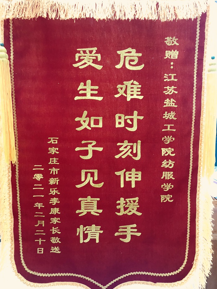 开学后,李康家长特意从石家庄寄来两面锦旗,以表达对学校、学院的感谢之情。家长赠与的锦旗,不仅是对学院防疫工作的认可,更是对我们纺织服装学院学生工作的褒奖与鞭策。