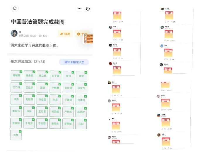 为响应学院号召,各班团支书组织全班学生参与“4.15”有奖竞答活动。这个活动将与国家安全相关的法律设置为题目,活动期间每天在中国普法微信公众号答题,并上传答题结果截图。与此同时组织各班开展团日活动,为同学们介绍国家安全的相关法律,使同学们对国家安全的重要性有了更深入的了解。此次活动将国家安全相关法律纳入学生的学习内容,推动深入学习,促进知行合一,营造“国家安全,人人有责”的良好舆论氛围。