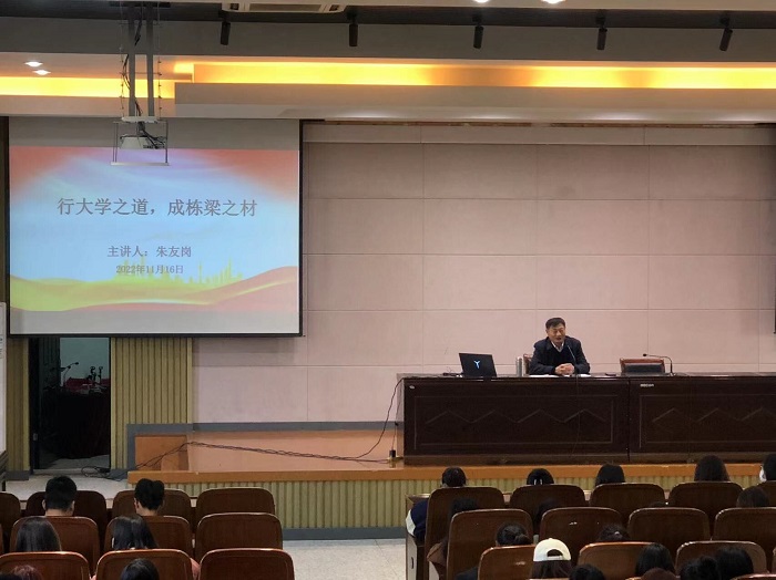 为了帮助大一新生快速适应学习环境的改变,有效助力学生们养成良好习惯,树立新阶段目标,我院邀请校关工委副主任朱友岗教授于11月16号下午两点在机械馆报告厅为大一新生开展“行大学之道,成栋梁之材”的主题报告,院学工办主任张秀丽主持,学院全体22级新生参加。
