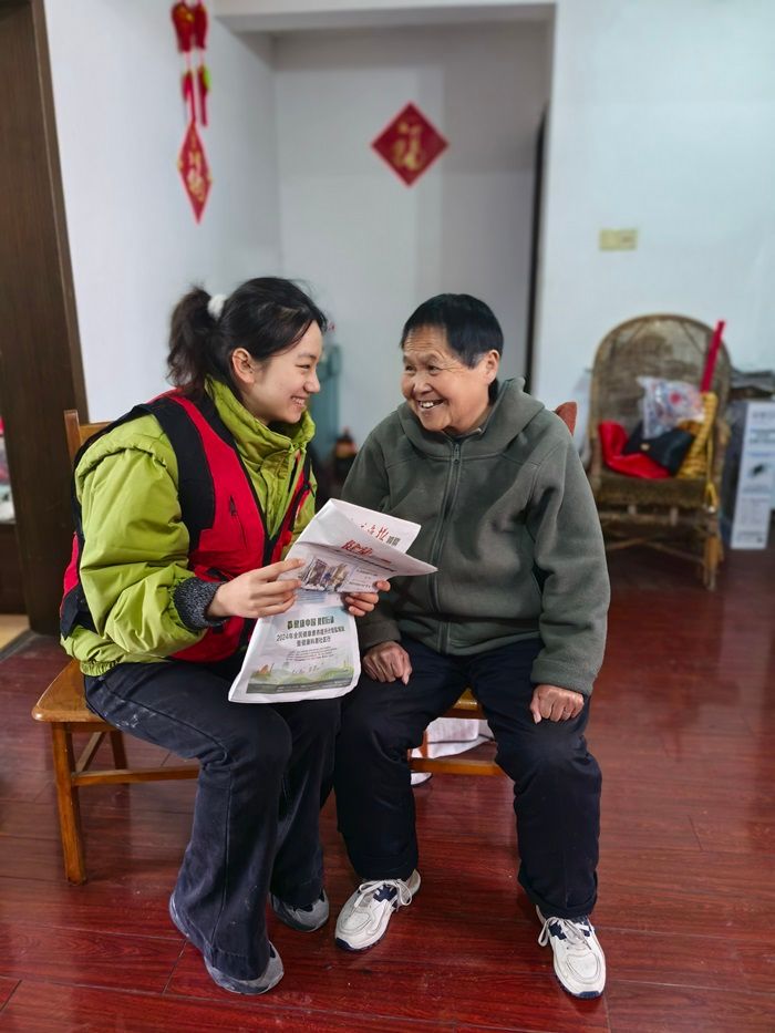 登瀛志愿者协会志愿者胡叔叔拿出提前准备好的专业理发工具,娴熟且仔细地为奶奶修剪头发,盐城工学院纺织服装学院B服工241班董诗沂手拿当日报纸,一字一字,身子微倾,慢声细语的给奶奶朗读着报纸上的新闻,从国内外大事,到本地的民生趣事,“奶奶,您听!”在温馨和谐的氛围中,她们还聊起了家常,这老中少定格的画面,将幸福具象化。这不仅让老人们了解到社会的最新动态,更让他们感受到外界的关怀。