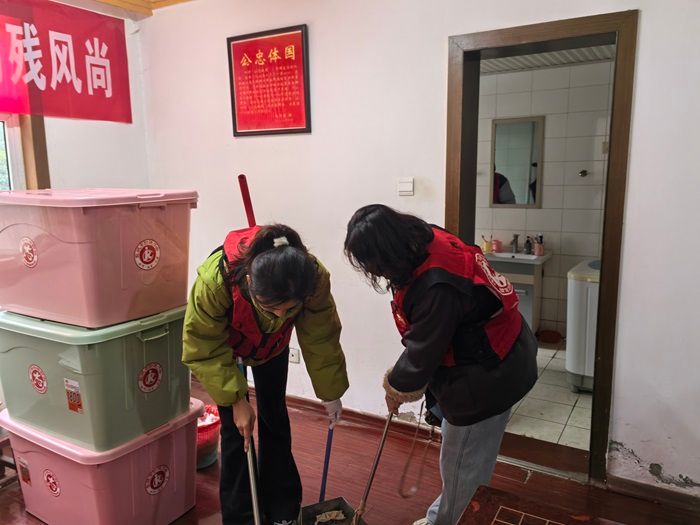 3 月 5 日上午 9 点,盐城工学院纺织服装学院的师生志愿者们身着整齐的志愿服,来到了锦绣北苑南门,在这里,他们将开展一场温暖的爱心行动。志愿者们“眼中有活、心中有爱”,一个个分工协作,有的手持扫帚、拖把,有的拿起抹布擦拭着“谷鉴今观”的牌匾,认真细致地清扫着家中的每一个角落。