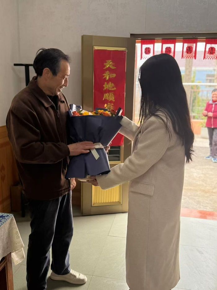 盐城工学院纺织服装学院志愿者代表徐淼庄重地向沈老献上一束鲜花,表达对革命先烈后辈的崇高敬意。淡雅的花朵映衬着沈老和蔼的笑容,他轻轻接过,眼中满是珍视。随后,他缓缓打开记忆的闸门,为我们讲述起父亲沈国扬的峥嵘岁月。