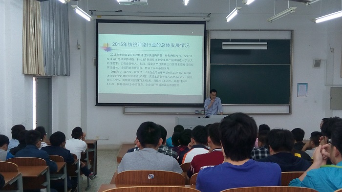 在报告会上,张虎校友为同学们介绍了纺织印染行业的发展现状及面临的形势,分析了纺织印染行业的发展方向,并带领同学们系统了解了色织布的印染工艺流程,他指出,纺织行业是关系国计民生的支柱性行业,前景广阔,勉励同学们认真学习,以后在行业中大展宏图。