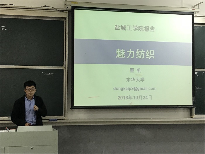 10月24日下午,我院在北校区体知楼S105举办校友报告会,邀请金利民和董凯两位校友返校为新生作报告。金利民为我院纺织工程专业03级校友,东华大学博士,高级工程师,现供职于中国科学院上海高等研究院;董凯为我院纺织工程专业09级校友,东华大学博士毕业后留校任教。纺织工程系主任陆振乾主持报告会,2018级纺织工程和轻化工程专业全体新生参加。