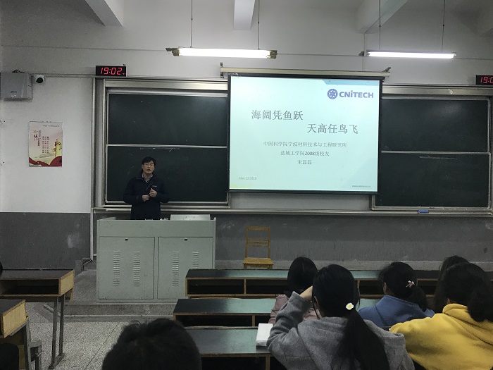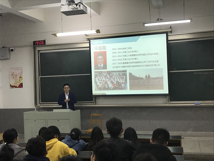 3月23日晚,纺织服装学院在建军路校区体知楼S103教室举行了校友报告会,邀请了我院纺织工程专业2008届校友、现中国科学院宁波材料技术与工程研究所博士后宋磊磊为2018级学生作报告,纺织工程系主任陆振乾主持报告会,2018级纺织工程、轻化工程专业全体学生参加。