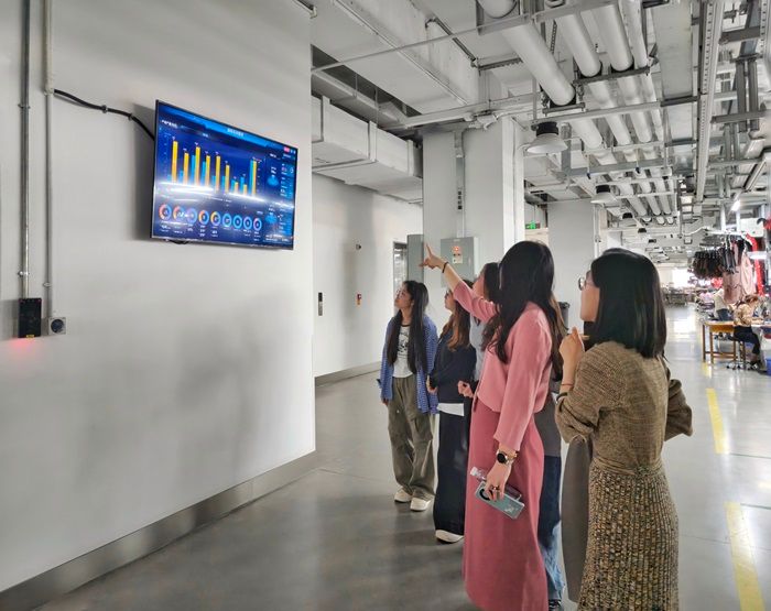 90后,年轻有为的副厂长金昊带领师生们深入生产一线,见证了企业集制造系统合力,历时8年达到的当代化制造业态,15000平方米立体设计的大平层生产区域应用瑞典ETON吊挂,三禾空中物流,飞榴MFS系统,让成衣按节拍在空中舞动,独立配置的智能终端助力每一位员工获取实时信息,愉悦并优质高效的开展工作。