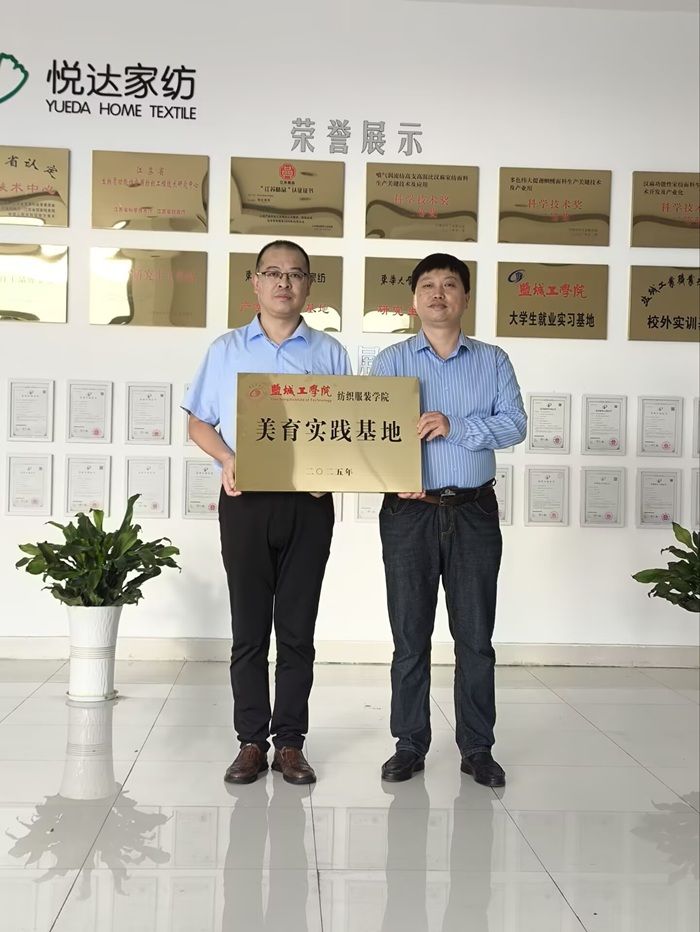 9月22日,学院又与悦达纺织集团联合举行实践基地共建活动。学院一行赴悦达纺织集团,参观企业生产线与设计中心,了解现代纺织工艺与美学融合的最新成果。在随后的座谈中,双方围绕美育教育内容、企业导师参与教学、学生创新能力培养等方面展开深入探讨,并举行“美育实践基地”授牌及“美育实践导师”聘任仪式。此次合作将推动美育教育与产业实践深度融合,提升学生审美素养与创新能力。