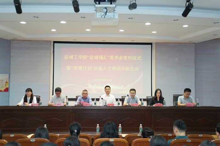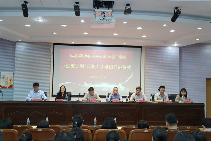 为深化产教融合协同育人,精准对接纺织行业人才需求,激励青年学子勤奋钻研,9月27日,盐城福汇纺织有限公司与盐城工学院联合举办的 “盐城福汇”企业奖学金签约仪式暨企业“雄鹰计划”后备人才综合能力培训开班仪式在盐城工学院土木馆举行。盐城工学院党委常委、副校长王伟出席签约仪式。福田实业(集团)有限公司副总裁兼盐城福汇纺织有限公司董事长、总经理李刚,盐城福汇纺织有限公司副总经理孔红岗、徐建国,纺织服装学院党总支书记宋孝浜、院长王春霞,副院长陆振乾,校友办副主任曹玉娟,以及“雄鹰计划”后备人才培训的学员、教师代表、学生代表共60余人参加此次活动。