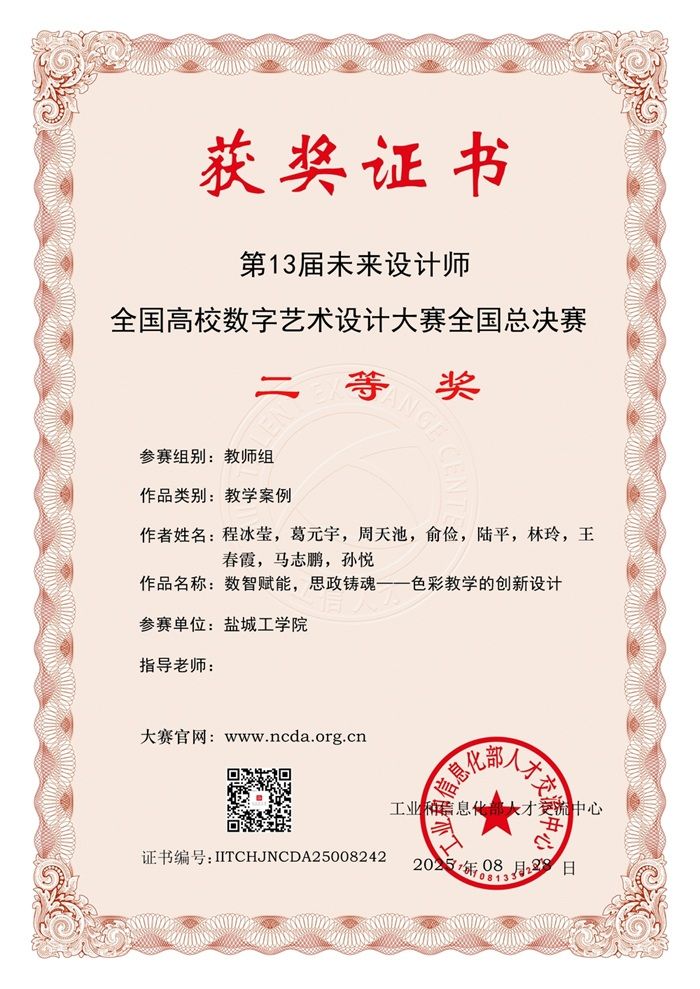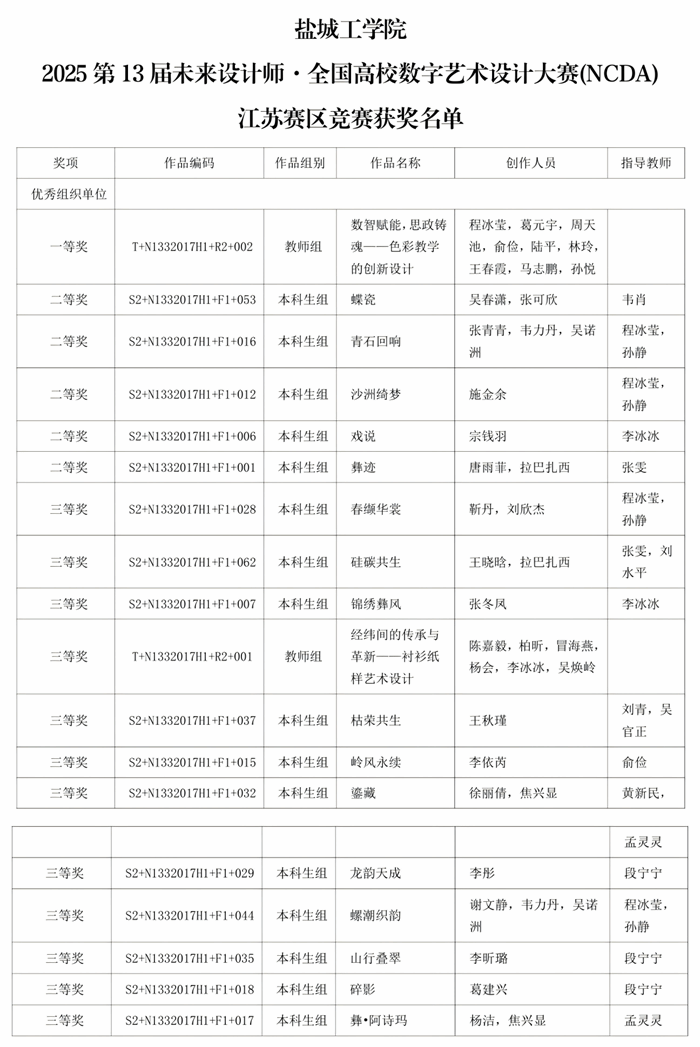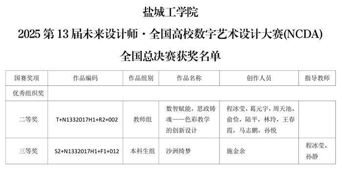 我院程冰莹老师指导施金余同学作品《沙洲绮梦》获得该项赛事国家级三等奖,程冰莹老师的教师组课程案例获得项赛事国家级二等奖,我院荣获优秀组织单位,柏昕老师荣获优秀组织老师奖,并有二十多位同学荣获江苏省二三等奖,五位老师荣获优秀指导教师奖,具体获奖公告如下: