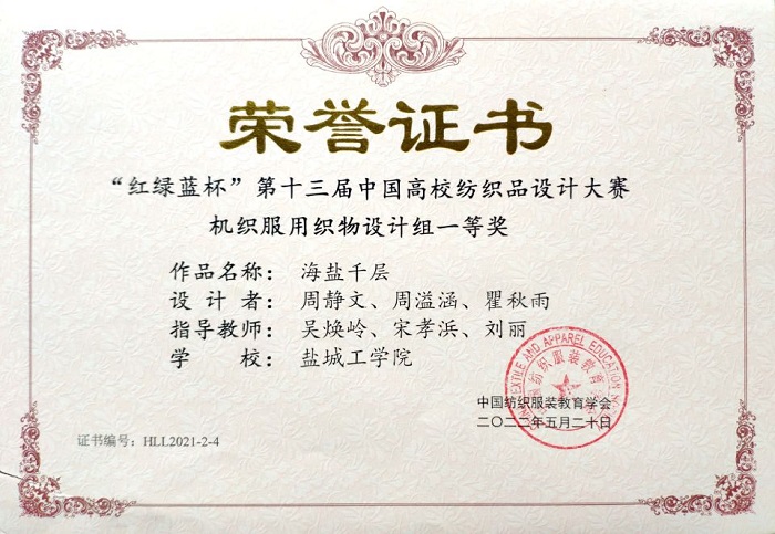 近日,中国纺织服装教育学会公布“红绿蓝杯”第十三届中国高校纺织品设计大赛获奖结果,我院学生团队获一等奖2项,二等奖8项,三等奖22项。其中,由郭岭岭、林洪芹、王春霞老师指导的《微掠光影》作品和吴焕岭、宋孝浜、刘丽老师指导的《海盐千层》作品均获机织服用织物设计组一等奖。