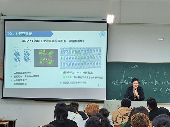 为帮助2022级新生更好地开拓学术视野,更多地了解专业前沿知识,更快地适应大学生活,10月25日下午,我院史超博士应邀为2022级轻化工程专业新生作了题为《分子筛主客体作用的高通量计量》学术讲座。