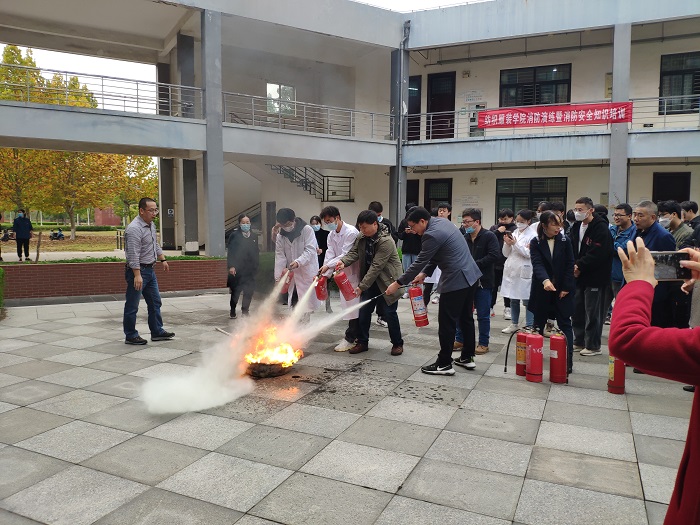 为使演练取得好的效果,本次活动特别邀请安保处安全管理科副科长宋兆群进行灭火相关技能培训。现场,宋兆群对全体演练成员强调了掌握消防安全知识的重要性,呼吁大家认真学习消防要领、牢固树立消防安全意识。同时,用通俗易懂的语言讲解了手提式干粉灭火器的使用方法和注意事项,指出要根据风向,对准火源根部,进行“一提二拔三压四喷”四个规范操作,并现场示范灭火的技能。最后,教职工及学生代表通过“零距离”操作灭火器,熟练掌握了灭火器的操作要点和动作要领。