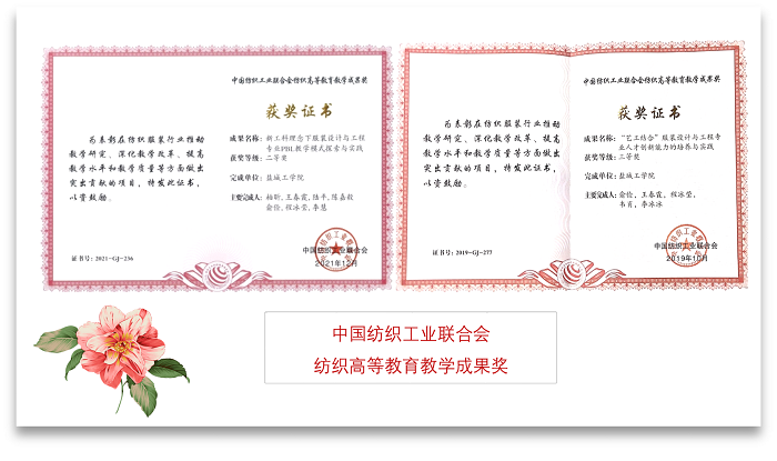 服装设计与工程专业坚持艺术和工程相结合,理论与实践相结合,倡导以学生为中心的教育理念,构建多元化新型课堂教学模式。柏昕老师的“新工科理念下服装设计与工程专业PBL教学模式探索与实践”、俞俭老师的 “艺工结合”服装设计与工程专业人才创新能力的培养与实践”,分别获得中国纺织工业联合会纺织高等教育教学成果奖二等奖和三等奖。