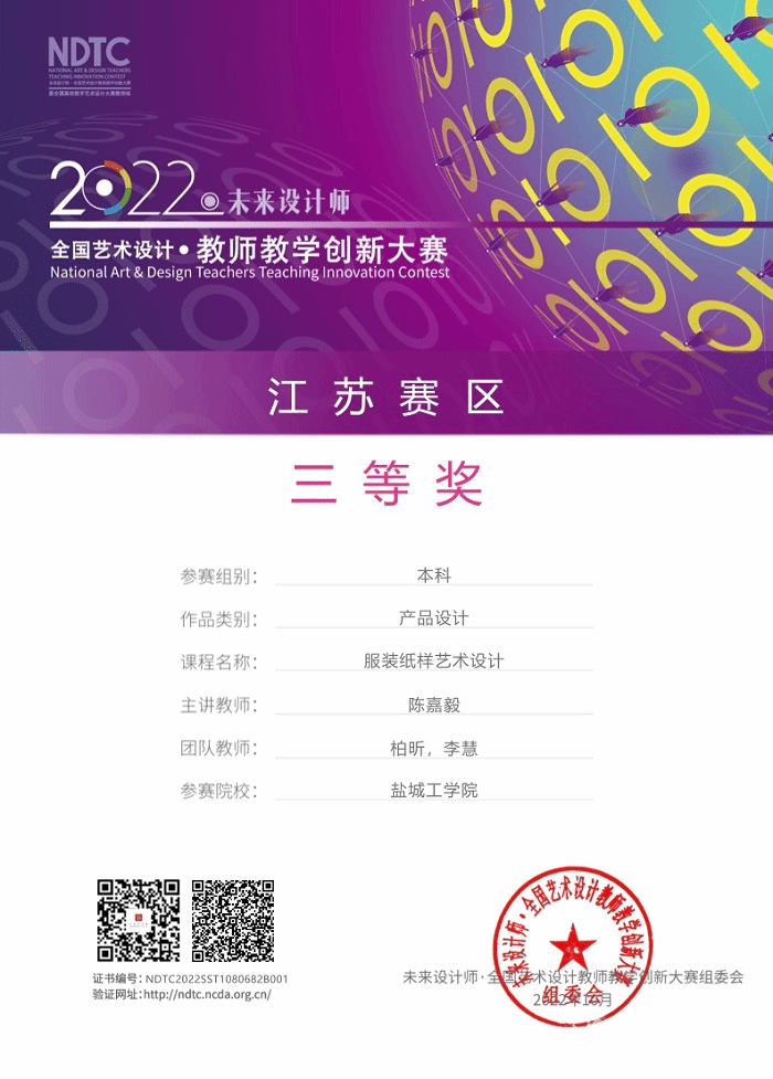 近日,服装设计与工程专业由陈嘉毅、柏昕和李慧组成的青年教师团队荣获2022全国艺术设计•教师教学创新大赛(教创赛)江苏赛区三等奖。团队展现了生动的课堂教学、精彩的线上说课以及丰富全面的教学创新成果报告。