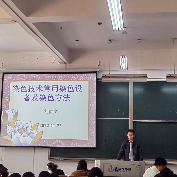 为帮助轻化工程专业学生了解染整专业的发展现状与前景,激发学习兴趣,11月16日下午,在博学楼D313教室,刘世文、何雪梅、王丽丽老师分别进行了《染色技术常用染色设备及染色方法》、《 碳纤维活化及其功能复合材料的发展及应用》、《纤维素纳米晶/聚酰胺6复合长丝的开发研究》的专题报告,学院科研院长周天池主持,学生累计80余人参加。