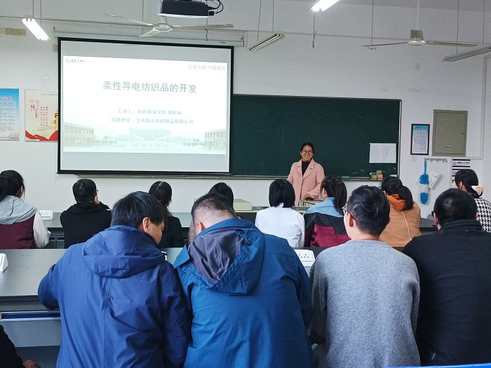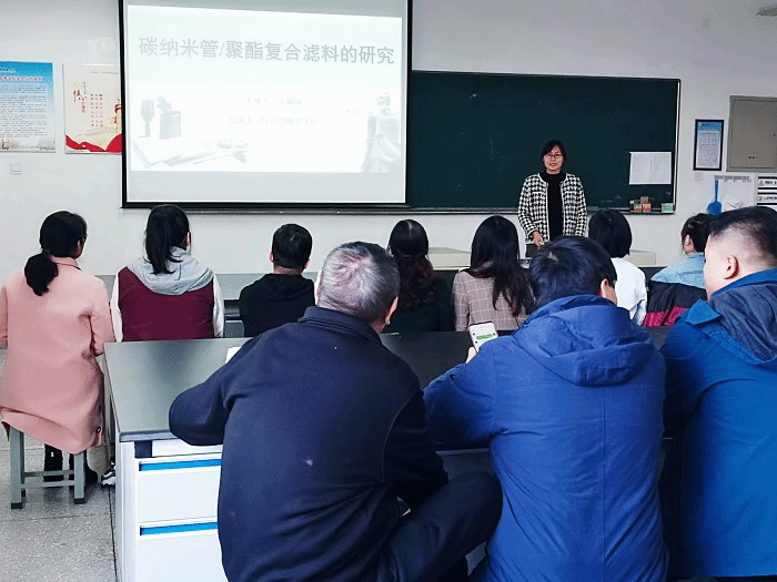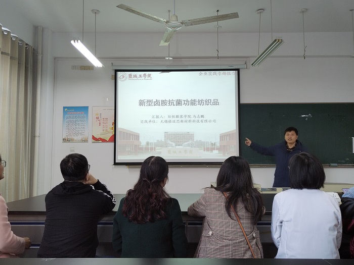 11月25日下午,我院在怀德楼B204开展“企业实践锻炼”专题报告会。教师马志鹏、林洪芹、王丽丽、郭岭岭分别以“新型卤胺抗菌功能纺织品”、“活性炭纤维毡填充纬向管状凸起织物的开发”、“碳纳米管/聚酯复合滤料的研究”、“柔性导电纺织品的开发”作专题报告,参会教师30余人。老师们通过PPT展示了在企业锻炼的情况,分享了在实践锻炼中获得的新知识、新工艺、新产品等。