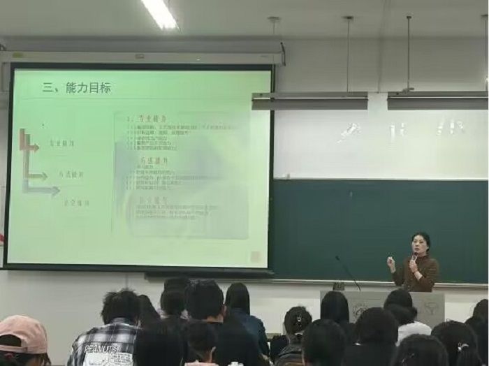 讲座开始,柏昕老师进行了自我介绍并向同学们展示了往届优秀学员的毕业设计。本次讲座中,柏昕老师主要从就业前景、专业人才培养目标、能力目标、职业面向、课程体系与专业特色、师资团队、实验室实习基地、希望和要求八个方面展开专业介绍。