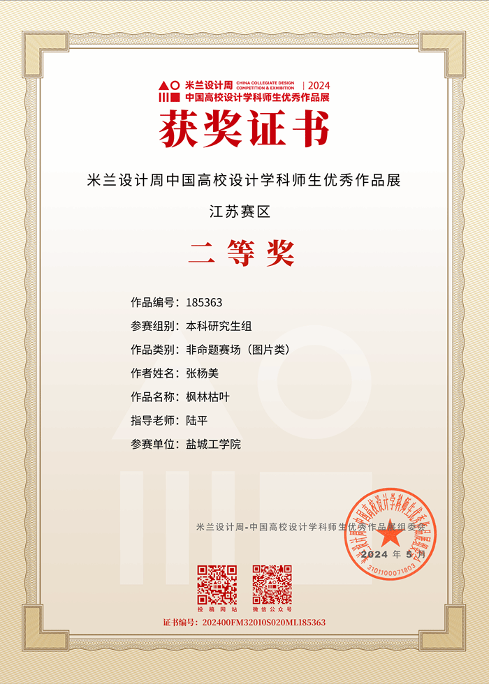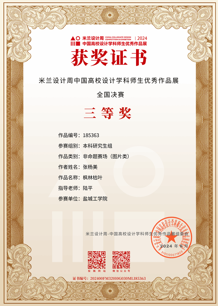近日,由中国教育国际交流协会、中国高等教育学会联合主办,中国教育国际交流协会承办的2024“米兰设计周——中国高校设计学科师生优秀作品展”中,我院陶如嫣同学和张杨美同学在陆平老师的指导下,分获省赛一等奖、二等奖,国赛二等奖、三等奖的好成绩。同时陈嘉毅、程冰莹、李慧、孟灵灵和陆平老师分别指导学生获得省赛二等奖3项、三等奖7项,程冰莹、高大伟、王丽丽和周青青老师分别获得教师组省赛二等奖1项和三等奖3项。