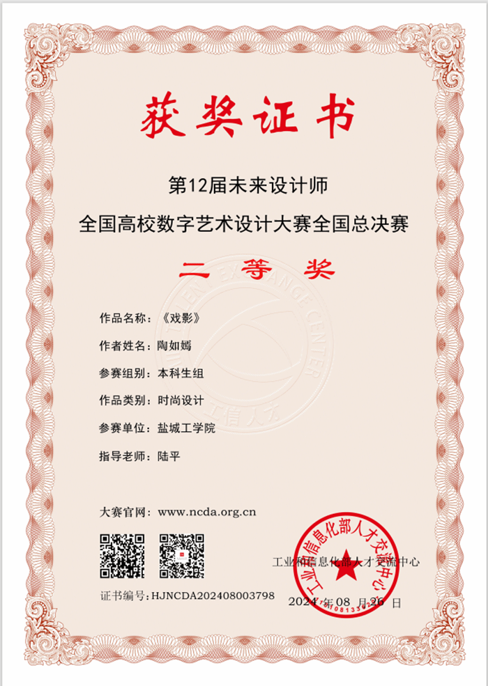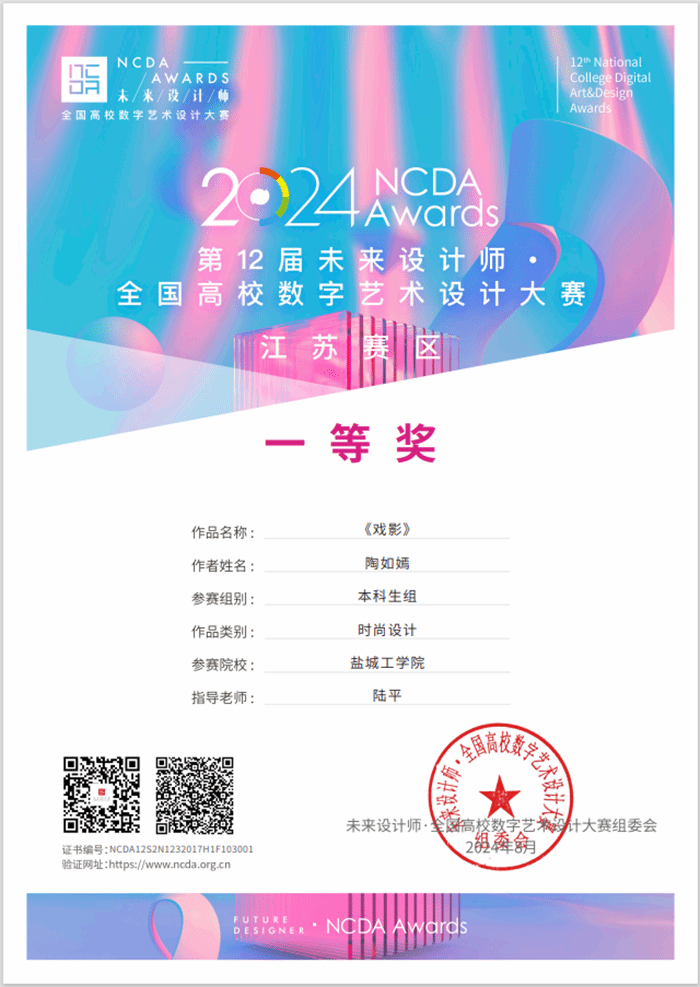 近日,未来设计师•全国高校数字艺术设计大赛(NCDA)落下帷幕。我院陶如嫣同学在陆平老师的指导下,其作品《戏影》获得该项赛事省级一等奖、国家级二等奖的好成绩,这是我院在国家级学科赛事中的重大突破。指导教师引导学生将中国传统文化元素融入现代设计中,从中国传统文化中汲取灵感,帮助学生理解“中国风”不仅是对传统元素的简单复制,而是要在理解传统文化的基础上,进行创新性的转化和应用。帮助学生在设计中找到文化传承与时尚创新之间的平衡点,在保留传统工艺特色的同时,引入现代设计理念,在传统图案和色彩的基础上,引导学生设计出具有一定文化深度兼具时代感的系列作品。此外,陆平、陈嘉毅、柏昕、程冰莹和李慧老师指导学生分别获省赛二等奖2项和三等奖4项。