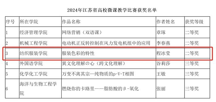 近日,2024年江苏省高校微课教学比赛获奖名单公布。我院程冰莹老师微课作品《服装色彩特性》荣获二等奖。
