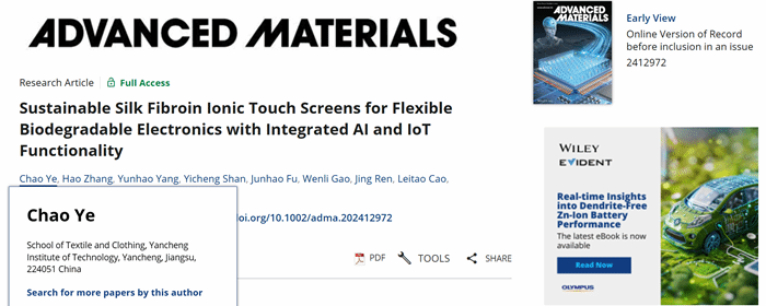 近日,纺织服装学院叶超博士与上海科技大学合作在国际材料学科顶尖期刊Advanced Materials上发表题为“Sustainable Silk Fibroin Ionic Touch Screens for Flexible Biodegradable Electronics with Integrated AI and IoT Functionality”的研究成果(DOI:https://doi.org/10.1002/adma.202412972)。其中盐城工学院为第一通讯单位,叶超博士为第一作者。这是纺织服装学院教师首次以第一作者、盐城工学院为第一通讯单位在Advanced Materials期刊(IF=27.4)上发表高水平研究论文,标志着学院的前沿学术科研水平不断增强,人才队伍建设效果明显。该工作获得了国家自然科学基金及盐城工学院人高层次才科研启动项目的资助。