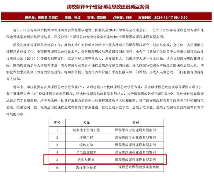 近日,江苏省高等学校教学管理研究会课程思政建设工作委员会2024年学术年会在南京召开,公布了2024年省课程思政专业和课程建设典型案例征集评选结果,我院程冰莹老师团队的《色彩与图案》课程获评江苏省思政课程建设典型案例。