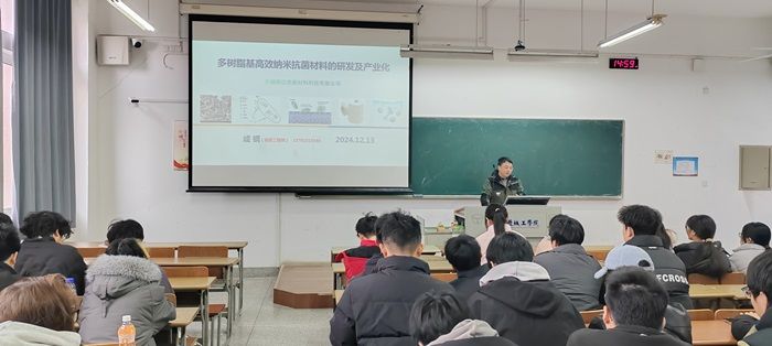 成钢以“多树脂基高效纳米抗菌材料的研发及产业化”为题,同时结合自身在物理抗菌面料产业的创业经历,给纺织工程专业大二学生做了详细的讲座。成钢从创业项目的研究背景出发,介绍了当前市场上抗菌面料的痛点(主要靠化学整理,耐久性差),以及创业团队在物理永久抗菌面料的研发历程和成果。讲座现场的现场气氛热烈,成总与同学们展开了亲切的互动,同学们对纺织专业企业的前沿科技有了深入的了解,增强了职业认知,成总的创业经历和研究历程也为学生未来的职业发展提供了榜样。