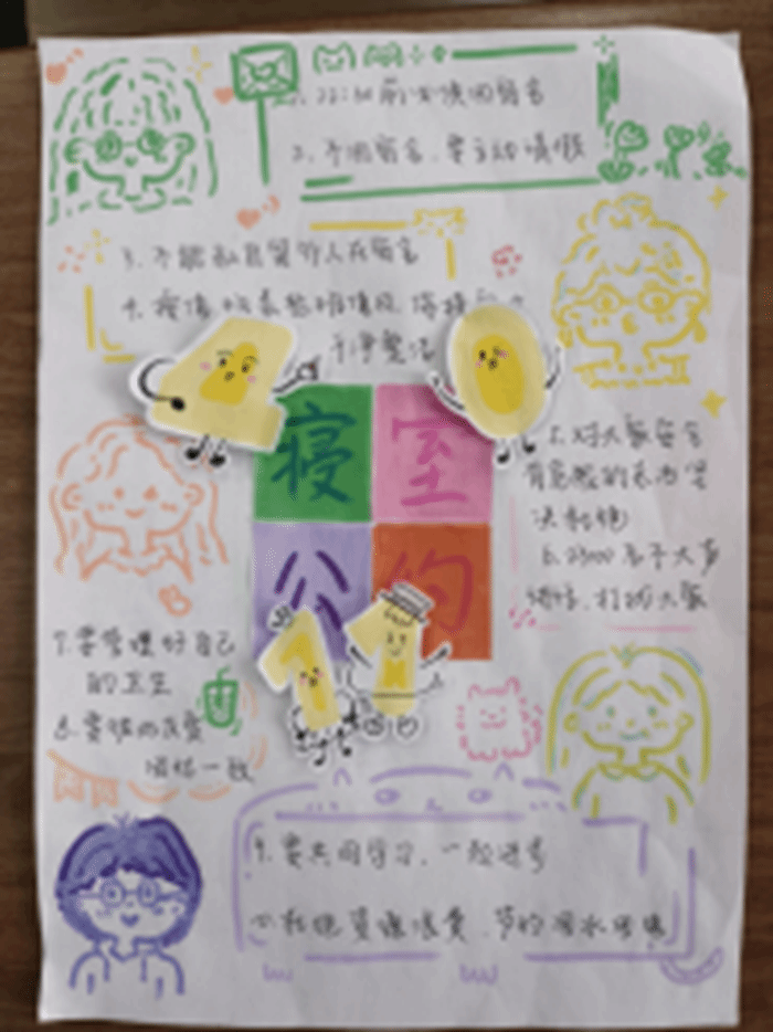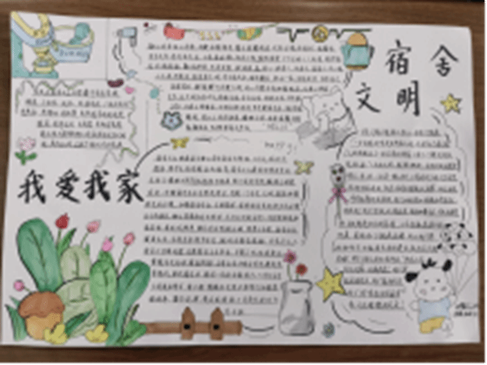 此项活动要求寝室成员共同参与一起绘制出专属于他们的“寝室公约”,同学们积极参与,最终经过学生处评选,选出优秀作品8件。