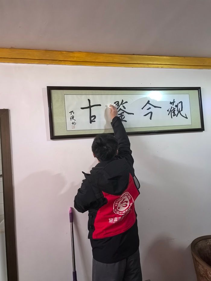 3 月 5 日上午 9 点,盐城工学院纺织服装学院的师生志愿者们身着整齐的志愿服,来到了锦绣北苑南门,在这里,他们将开展一场温暖的爱心行动。志愿者们“眼中有活、心中有爱”,一个个分工协作,有的手持扫帚、拖把,有的拿起抹布擦拭着“谷鉴今观”的牌匾,认真细致地清扫着家中的每一个角落。
