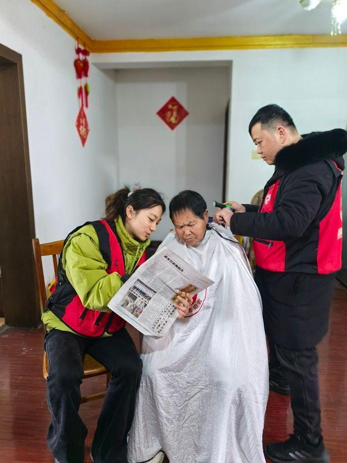 登瀛志愿者协会志愿者胡叔叔拿出提前准备好的专业理发工具,娴熟且仔细地为奶奶修剪头发,盐城工学院纺织服装学院B服工241班董诗沂手拿当日报纸,一字一字,身子微倾,慢声细语的给奶奶朗读着报纸上的新闻,从国内外大事,到本地的民生趣事,“奶奶,您听!”在温馨和谐的氛围中,她们还聊起了家常,这老中少定格的画面,将幸福具象化。这不仅让老人们了解到社会的最新动态,更让他们感受到外界的关怀。