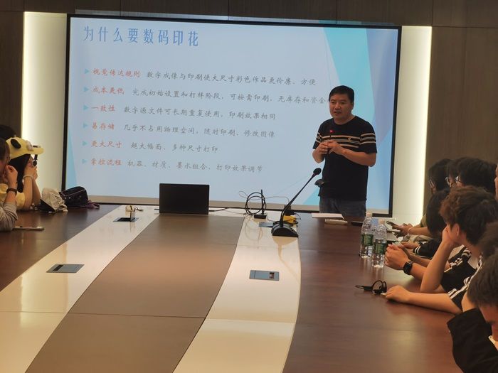 郑成辉老师结合企业生产现场进行讲解,深入剖析数码印花工艺流程与原理,让学生近距离感受理论知识在实际生产中的应用。在企业技术人员指导下,学生们在企业车间参与实际操作,将课堂学习与生产实践紧密结合,有效提升专业技能。