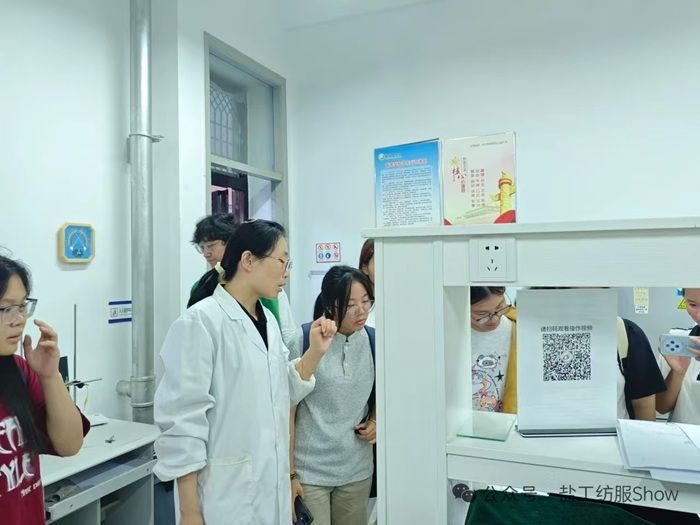在实验中心周青青老师的带领和讲解下,同学们有序地参观了纺纱实训平台、大型染整实验室以及纺织品展示室等。参观期间,周老师还结合不同场所的实验特点,详细地向同学们介绍了实验仪器的用途以及实验室安全等方面的内容,同时耐心解答了同学们提出的关于专业学习与实验实践的疑问。