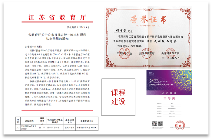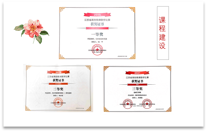 在课程建设方面,陆平老师主持的《立体裁剪》获江苏省教育厅认定的省级一流本科课程;陆平、程冰莹、陈嘉毅老师分别获得江苏省高校微课教学比赛一、二、三等奖;程冰莹老师在第四届江苏省高校青年教师教学竞赛暨第六届全国高校青年教师教学竞赛选拔赛中,获文科组二等奖;陈嘉毅老师在全国艺术设计·教师教学创新大赛中获江苏赛区三等奖。