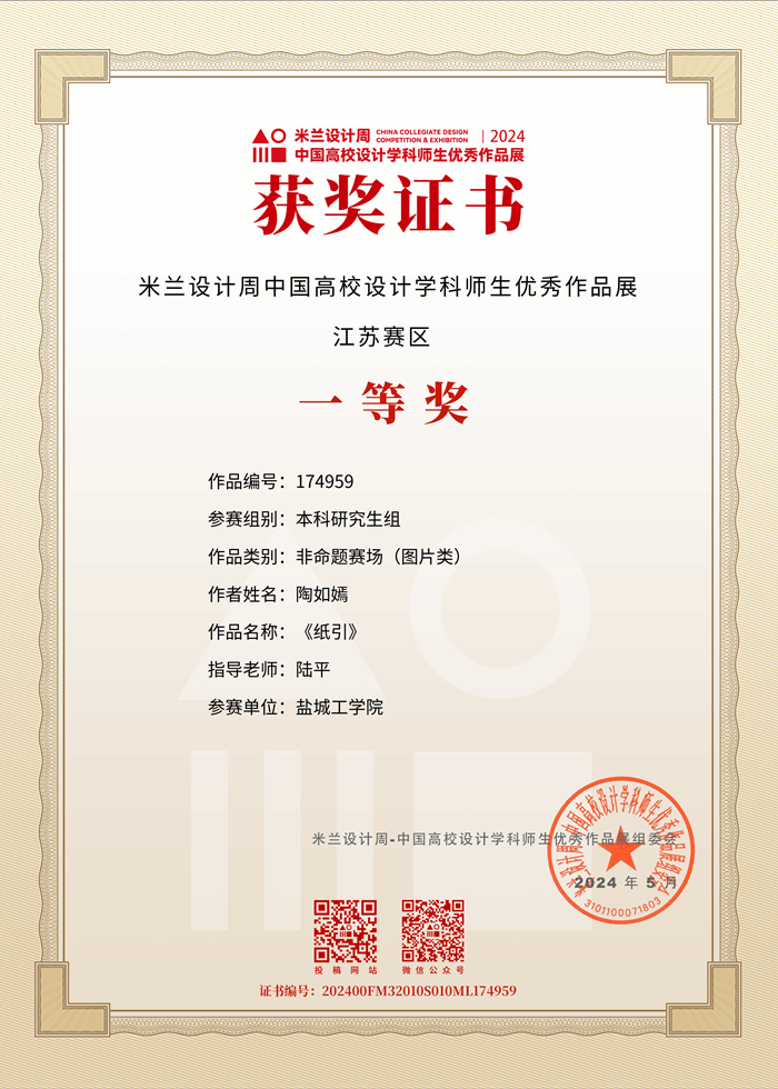 近日,由中国教育国际交流协会、中国高等教育学会联合主办,中国教育国际交流协会承办的2024“米兰设计周——中国高校设计学科师生优秀作品展”中,我院陶如嫣同学和张杨美同学在陆平老师的指导下,分获省赛一等奖、二等奖,国赛二等奖、三等奖的好成绩。同时陈嘉毅、程冰莹、李慧、孟灵灵和陆平老师分别指导学生获得省赛二等奖3项、三等奖7项,程冰莹、高大伟、王丽丽和周青青老师分别获得教师组省赛二等奖1项和三等奖3项。