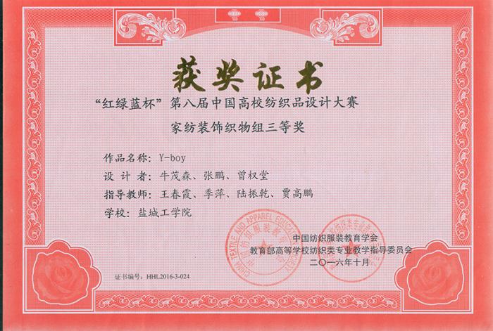 纺织工程专业家纺设计团队将大四毕业设计的遗留问题放到大三学生学科竞赛中去解决,给学生带来设计思路的同时也激发学生的创作热情,家纺装饰面料“Y-BOY(Young Boys)”产品纹样设计的灵感来源于“俄罗斯方块游戏”,字母在“5×5”矩阵中用方块堆砌而成,并巧妙运用织物组织设计,使原本在大提花织机上织造的LOGO图案可在多臂织机上织造,与大提花织机相比,多臂织机运行速度快、设备成本及维修费用低,该设计在中国纺织教育学会举办的“红绿蓝杯”第八届中国高校纺织品设计大赛家纺装饰组三等奖,这是家纺设计团队首次参加这个大赛,这个成绩的取得是对近年来纺织工程专业通过强化毕业设计团队建设提高卓越背景下纺织人才培养质量的工作的肯定。