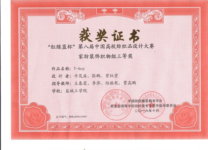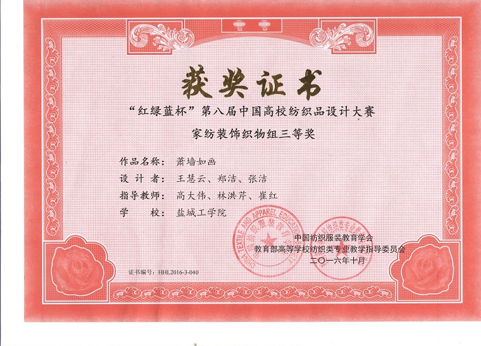 “红绿蓝杯”中国高校纺织品设计大赛由教育部、中国纺织工业联合会、中国纺织服装教育学会主办,是教育部纺织类教学指导委员会直接主办的中国高校设计比赛中最高级别和具影响力的传统赛事之一。本届大赛由绍兴县人民政府和绍兴文理学院共同承办。大赛共收到盐城工学院、苏州大学、江南大学、天津工业大学、浙江理工大学、西安工程大学等26所高校参赛作品911份。我院高度重视并积极组织学生参加此次大赛,经过层层选拔,推荐其中的7件作品参加了比赛,最后在高大伟、林洪芹、崔红、王春霞、季萍、陆振乾和贾高鹏等老师指导下喜获三等奖三项,目前这是我校参加该项比赛事以来获得的最好成绩。通过这次比赛,加强了学生与老师的沟通及与兄弟院校的交流,锻炼了学生动手能力,并对于纺织相关专业和就业的前景充满了信心。