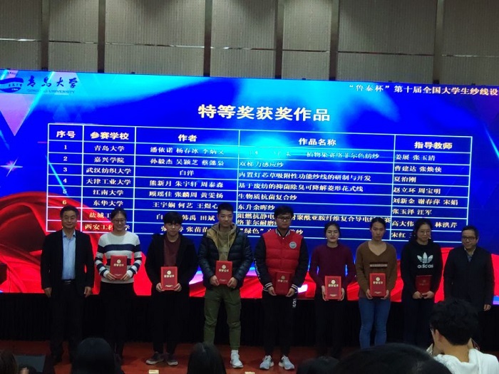 12月16日,“鲁泰杯”第十届全国大学生纱线设计大赛颁奖典礼在青岛大学落下帷幕。我校纺织服装学院师生在此大赛中表现突出,共获特等奖1项,二等奖6项,三等奖9项的好成绩。其中,高大伟、崔红和林洪芹老师指导的学生白志强、韩禹、田斌的参赛作品《阻燃抗静电防辐射聚酰亚胺纤维复合导电纤维赛络菲尔耐磨纱线》脱颖而出,以出色的创新设计荣获了特等奖。高大伟、崔红、林洪芹共3位教师被评为优秀指导教师,我校荣获最佳组织单位奖。