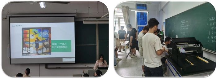 实习的高潮部分是学生们利用人工智能绘图技术(AIGC)设计印花图案。这项技术的应用不仅提高了设计效率,也激发了学生们的创造力。最后,学生们将设计好的图案通过数码印花技术实践印制出来。这一过程不仅锻炼了学生们的动手能力,也让他们体会到了从设计到成品的完整流程。